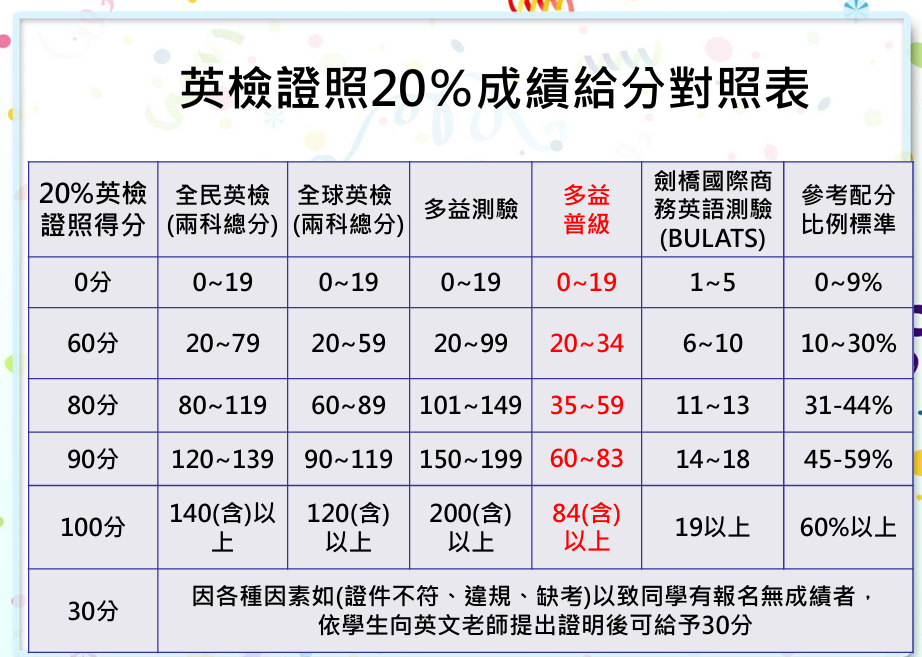 4.日間部四技新生英英檢證照佔學期20%成績給分對照表: